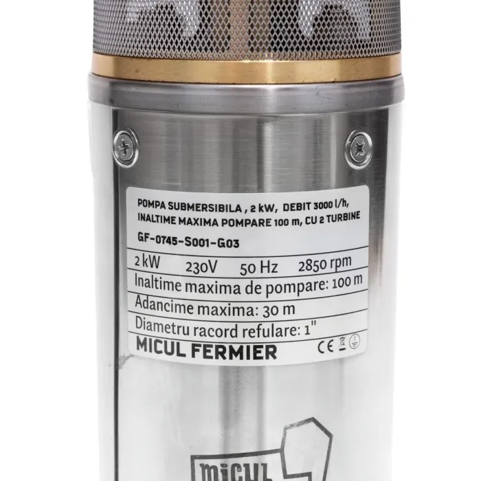 Оборудвана е с две високопроизводителни турбини, които гарантират голям хидравличен дебит и превъзходна енергийна ефективност. Електродвигател с изцяло медна намотка и ротор от неръждаема стомана. Потопяемата помпа Micul Fermier е проектирана за ефективно извличане на чиста вода от дълбоки източници. Със своята мощност от 2kW и максимален напор от 100 метра, тя осигурява дебит до 3000 л/ч.