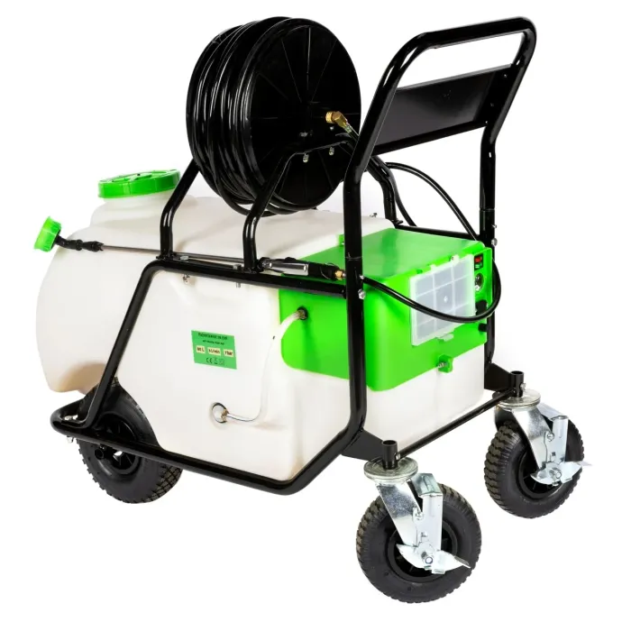 Маркуч 50 метра с макара за навиване – позволява пръскане на големи разстояния без често местене на машината.