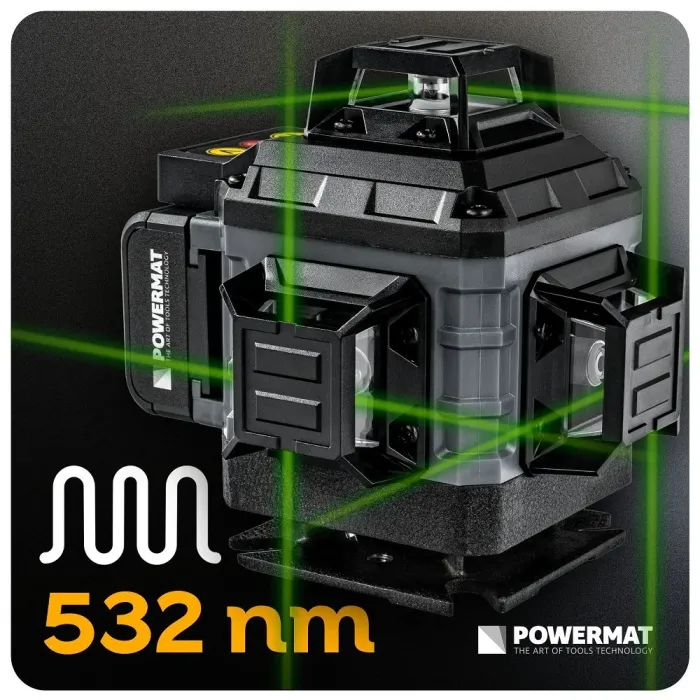 Зелен лазер с висока видимост: Дължината на вълната от 532 nm осигурява много по-добра яснота от стандартните червени лъчи. Линиите са четливи дори в големи помещения.