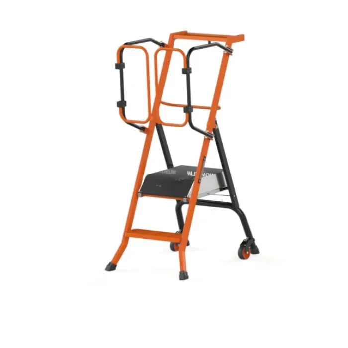 Колелата са оборудвани с пружинен механизъм. За да преместите платформата, е достатъчно просто да я бутнете с крак – без необходимост от повдигане. Колелата осигуряват плавно и бързо придвижване по работната площадка. Професионална алуминиева платформа за работа на височина. Това не е просто обикновена стълба, а мобилно скеле, проектирано за максимална безопасност и комфорт при довършителни работи.