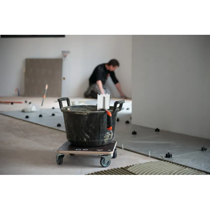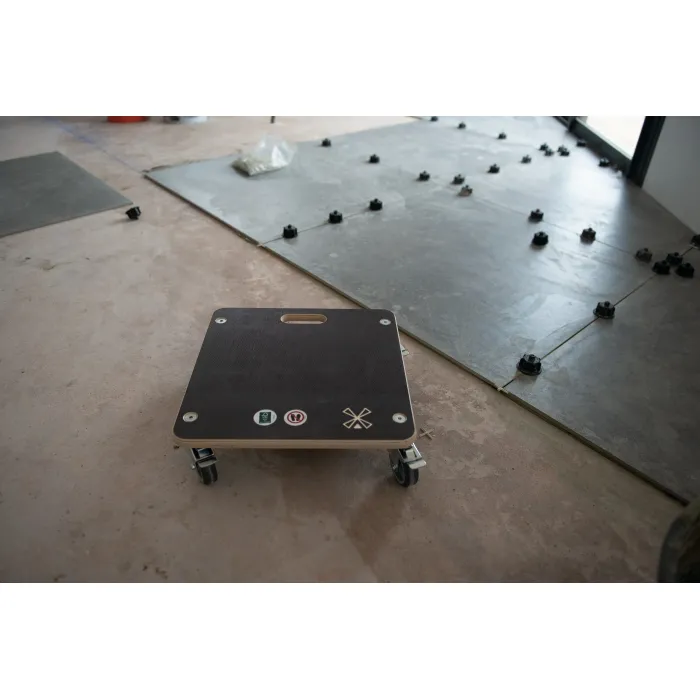 Оборудвана с 4 колела, въртящи се на 360°, което позволява лесно управление дори в най-тесните пространства. Всяко от четирите колела разполага със собствена спирачка за стабилно фиксиране на платформата при товарене и разтоварване. Гуми от TPR каучук, които осигуряват безшумно движение и не оставят следи по деликатни подови настилки. Интегрирана ергономична дръжка (отвор) за удобно пренасяне на самата платформа с една ръка.