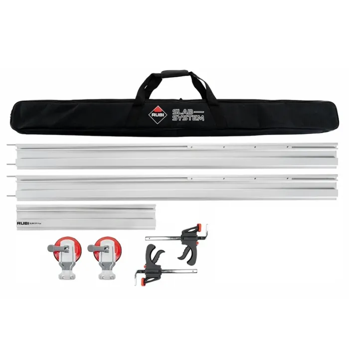 Комплект от линеал за рязане на фаянс, 2 вендузи и 2 фиксиращи стеги в текстилна торба. Линеалът е подходящ за сухо и мокро рязане на стандартни и голямоформатни керамични и порцеланови плочки, естествен и изкуствен камък с дължина до 320 мм. Комплектът е предназначен за работа с електрическия циркуляр с диамантен диск Rubi TC-125 G2.