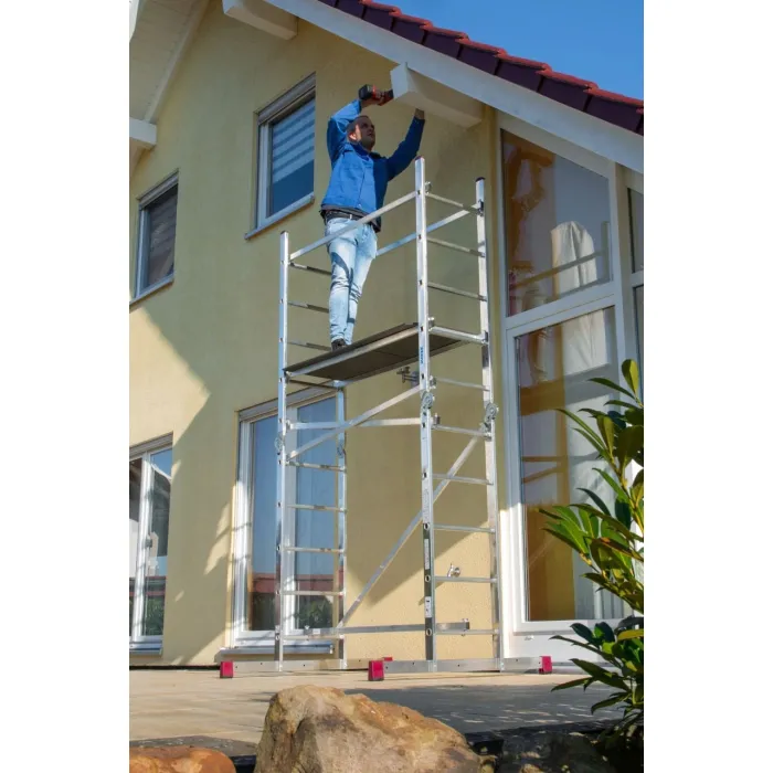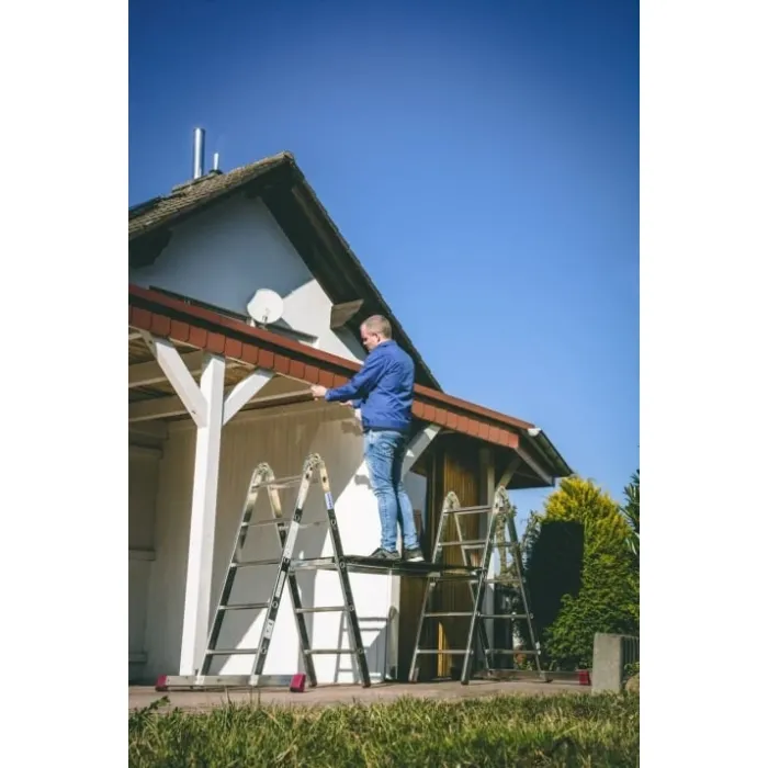 Благодарение на 2 интегрирани колела на единия стабилизатор, платформата е мобилна в сглобено състояние. Пести време при сглобяване, поради използването на четири иновативни панти на елементите на стълбата. Подходяща за използване на стълбища и площадки. Платформа, устойчива на хлъзгане и атмосферни влияния (размер на платформата 1,.50 м x 0.56 м). 2 широки стабилизатора за допълнителна стабилност. Държач за баластни тежести (баластни тежести като налични аксесоари) са включени в пакета. Платформа, подходяща за максимално натоварване от 150 кг/м².