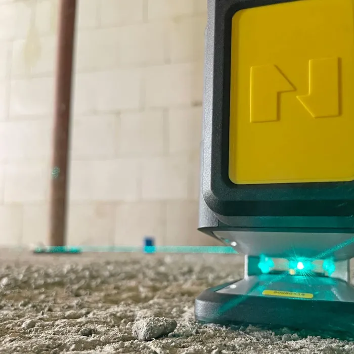 Нивелирът е готов за работа веднага след включване. Синият лъч е отлично видим и формира ясни референтни линии. Тъй като е по-фин и не заслепява, той подобрява комфорта дори в силно осветени помещения.