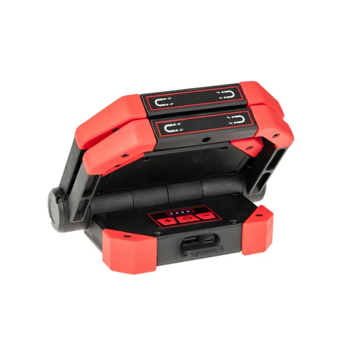 Въртящото се тяло (360°) и регулируемата дръжка (270°) осигуряват възможност за регулиране на посоката на излъчване на светлината. Прожектор, изработен от издръжлив найлон, алуминий и термопластичен каучук TPR . Прожектор, оборудван с два COB LED диода по 15 W. Максимална работна яркост: 2200 лумена.