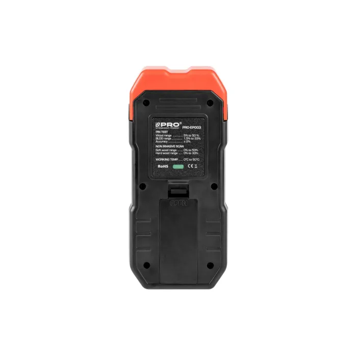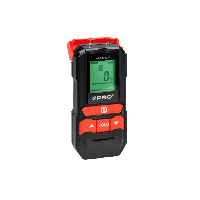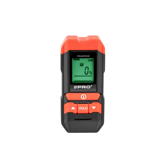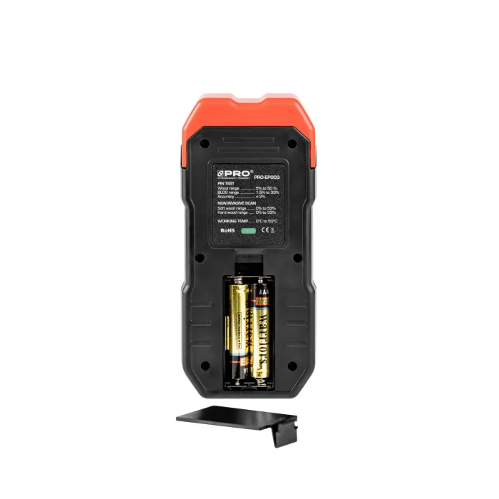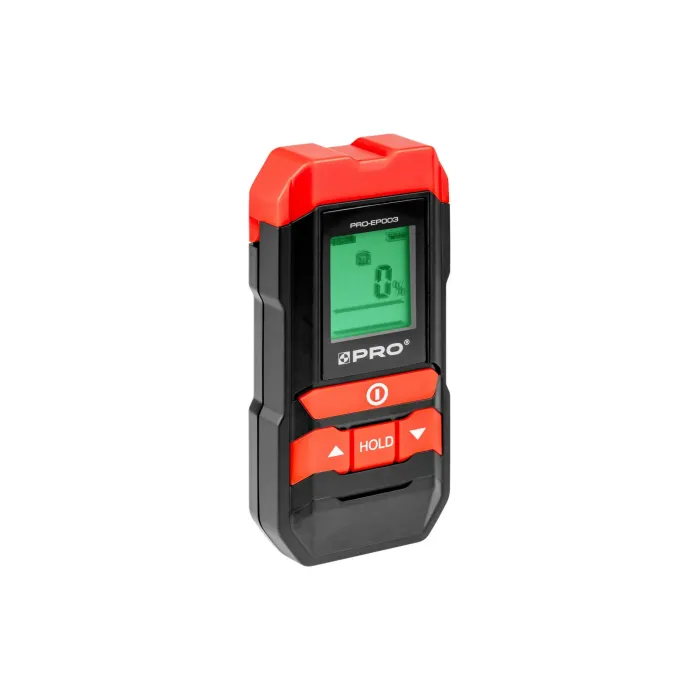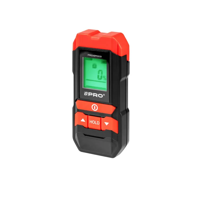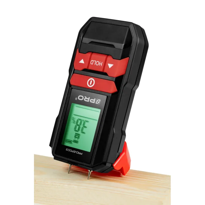 Детекторът сигнализира със звуков сигнал, когато влажността на дървесината надвиши 17% или влажността на стената надвиши 70% при измерване в неинвазивен режим на сканиране. Детекторът показва и околната температура в диапазона от 0-40°C Осветен и ясен дисплей. Влагомер – измерване с помощта на щифтова сонда и неинвазивен скенер. Щифтовата сонда предоставя данни с по-широк диапазон и по-голяма точност. Неинвазивният скенер предоставя данни без риск от увреждане на тествания материал, което е особено важно при работа с висококачествена екзотична дървесина и със строителни и довършителни материали. Различните режими на измерване съответстват на различни диапазони на измерване. Работа с щифтова сонда: дърво: 5%-50%, строителни материали: 1,5%-33%, диапазон на грешка: +/-2%. Работа с неинвазивен скенер: дърво: 5%-53%, строителни материали: 0-35%, диапазон на грешка: +/-4%. Четири режима на безконтактно сканиране за: мека дървесина, твърда дървесина, гипсокартон и бетон.