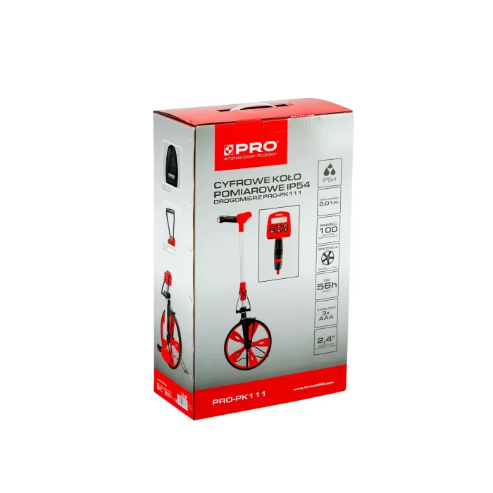 Комплектът включва: цифрово измервателно колело IP54, километраж PRO-PK111, ръководство за употреба, 3x aaa батерии, раница