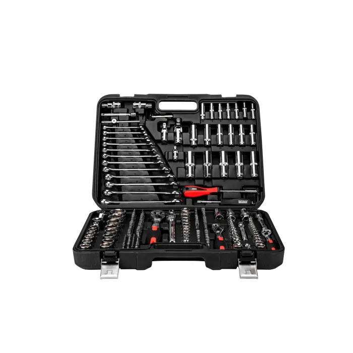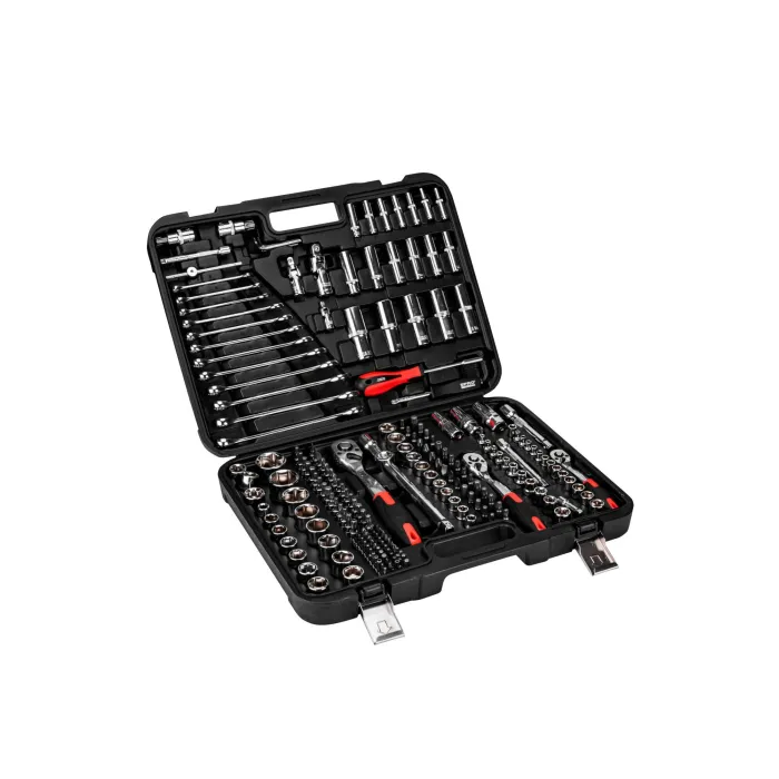 Изработена от издръжлива CR-V хром-ванадиева стомана. Тресчотки, оборудвани с прецизен тресчотен механизъм със 72 зъба и работен ъгъл от 5°. Елементите на комплекта са полирани, което ги предпазва от корозия и ги прави лесни за почистване. Пълен комплект глухи ключове 1/2", 3/8" и 1/4", състоящ се от 216 артикула: тресчотки, вложки, битове за отвертки и други аксесоари, както и функционален куфар.