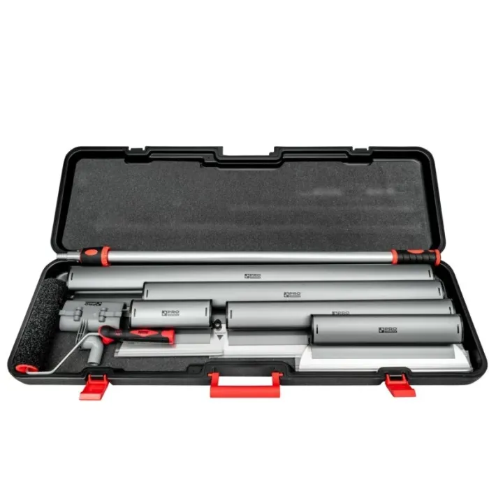 Възможност за смяна на острието чрез развиване на винтове и разхлабване на монтажната шина. Оборудването на мистрията с адаптер и телескопична щанга позволява удобно нанасяне върху високи стени и тавани. Остриетата са закрепени с калъф за многократна употреба. Адаптер и телескопично удължение, позволяващи нанасяне върху по-високи повърхности, например тавани и стени. Валяк с ширина 22 см за нанасяне на сместа с двукомпонентна дръжка. Кутия с дължина 110 см, изработена от здрав материал, устойчив на удар и сътресения.