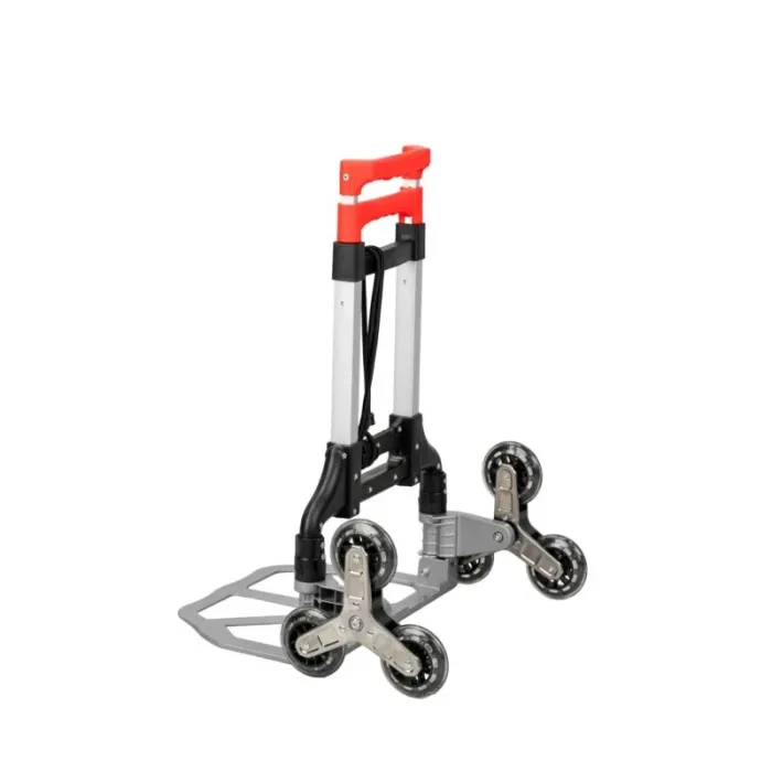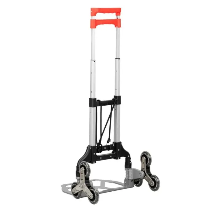 Сгъваема телескопична дръжка позволява регулиране на височината според индивидуалните нужди и значително улеснява съхранението и транспортирането. Сгъваема транспортна платформа, изработена от едно цяло парче, благодарение на което е здрава и издръжлива. Регулиране: 3 нива на регулиране на височината на дръжката. Ръчна количка за качване по стълби със сгъваема функция. Благодарение на здравата си алуминиева конструкция, ръчната количка е едновременно издръжлива и лека, което я прави по-лесна за работа.
