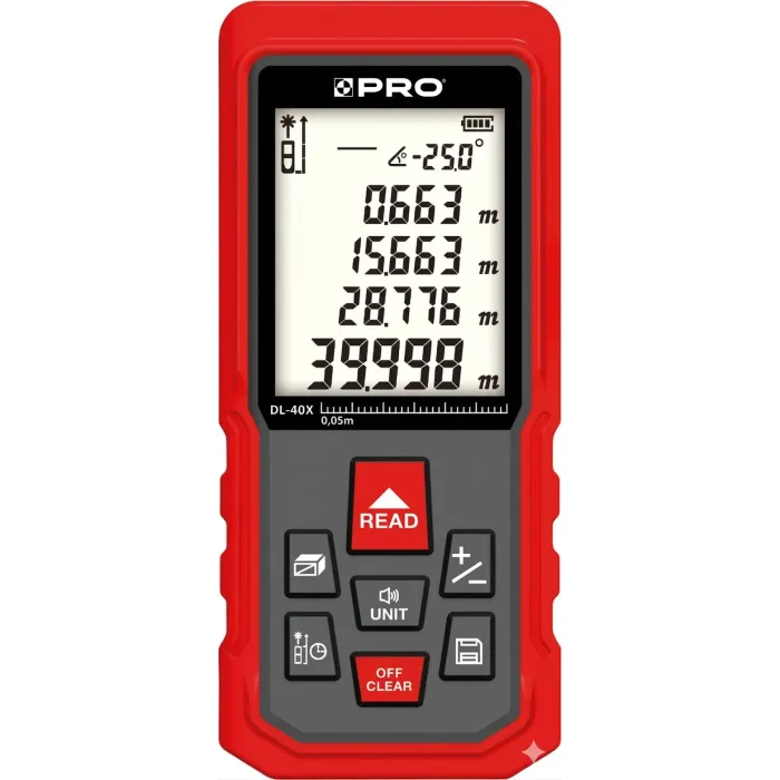 Три референтни точки за измерване: предна стена, задна стена на устройството и 1/4" вложка. LCD екран с подсветка. Разширената памет позволява запазване на измервания (до 99) и извършване на операции по събиране и изваждане върху тях. Автоматично изключване на лазера след 20 секунди, измервател на разстояние след 150 секунди. Лазерната ролека има функции: междинно измерване (с възможност за изчисляване на сума и разлика), непрекъснато и динамично измерване.