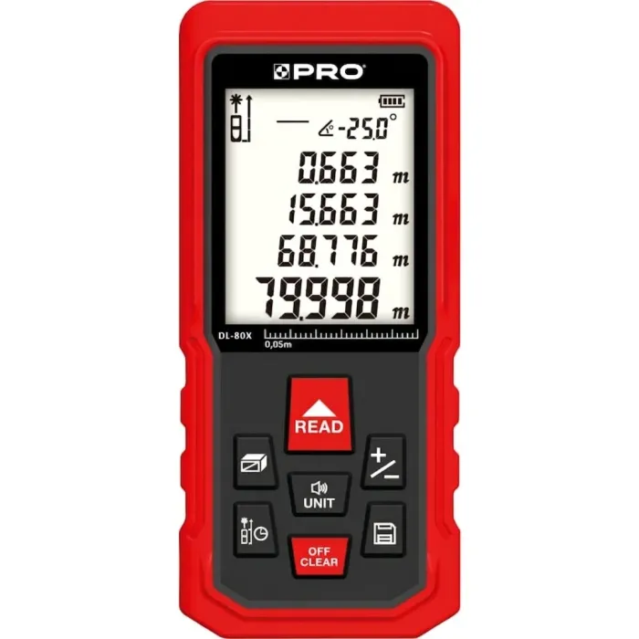 Три референтни точки за измерване: предна стена, задна стена на устройството и 1/4" вложка. LCD екран с подсветка. Разширената памет позволява запазване на измервания (до 99) и извършване на операции по събиране и изваждане върху тях. Автоматично изключване на лазера след 20 секунди, измервател на разстояние след 150 секунди. Лазерната ролека има функции: междинно измерване (с възможност за изчисляване на сума и разлика), непрекъснато и динамично измерване.