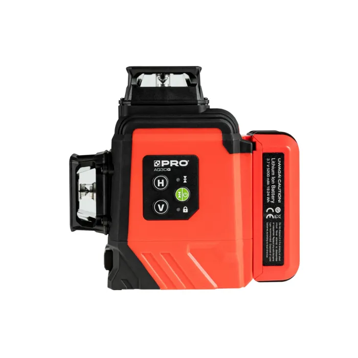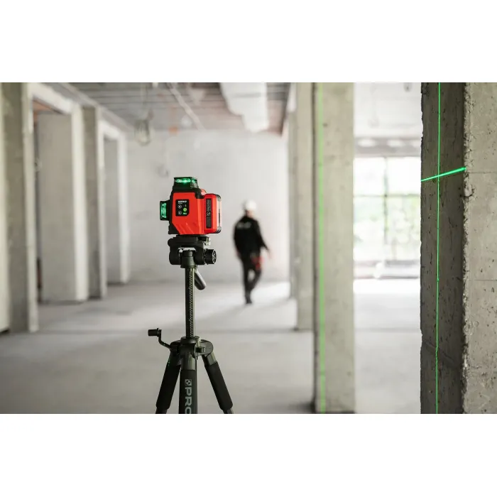 Възможност за маркиране на склонове благодарение на режима на работа с блокирано махало. Самонивелира се благодарение на магнитното махало. Степен на защита IP54. Наклонът на устройството извън работния диапазон от 3°±1° се сигнализира с пулсиращ звуков сигнал, заедно с мигане на лазерната линия. Лесен монтаж на статив или опъващ прът с резба 1/4". Многолинейният лазер PRO-AQ3DG генерира три 360° равнини, една хоризонтална и две вертикални равнини, пресичащи се под ъгъл от 90°. Импулсният режим за работа с детектор увеличава работния обхват на лазера. Функция на лазерен отвес (оста на кръста на тавана и пода определя отвеса).