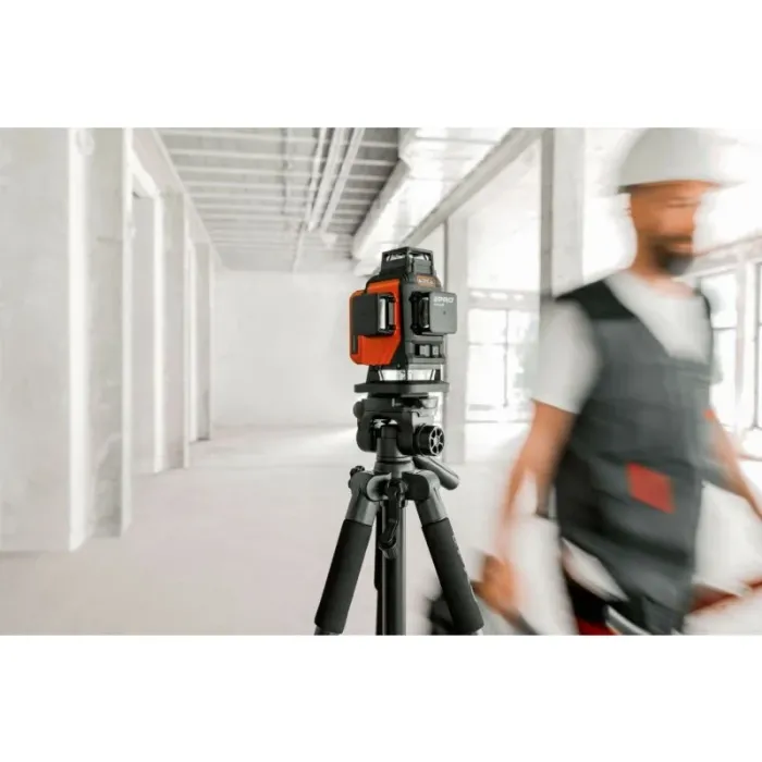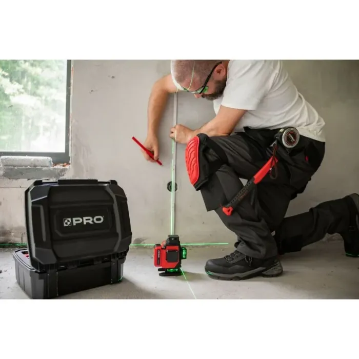 Възможност за определяне на наклони благодарение на режима на работа с фиксирано махало. Самонивелира се благодарение на магнитното махало. Клас на защита IP54. Отклонението на устройството извън работния диапазон от 3°±1° се сигнализира с пулсиращ звуков сигнал, заедно с мигане на лазерната линия. Лесен монтаж на статив или прът с резба 1/4". Многолинеен лазер PRO-AQ4DG генерира 4 равнини на 360°, две хоризонтални и две вертикални, пресичащи се на 90°. Пулсиращият режим за работа с детектор увеличава работния обхват на лазера функция на лазерен отвес (напречната ос на тавана и земята определя вертикалата).