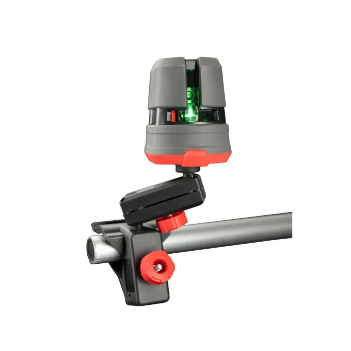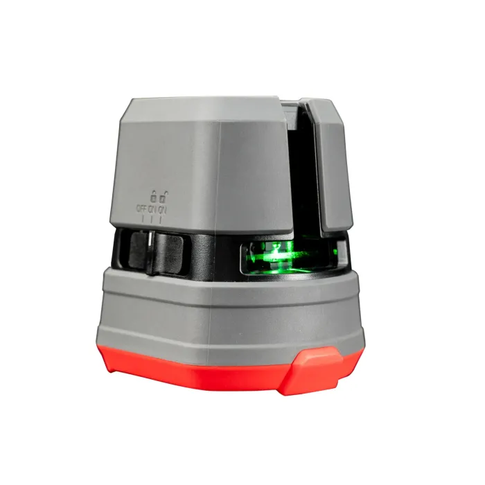 Лазерът се самонивелира благодарение на магнитно махало. Устройството е с водоустойчивост IP54. Когато устройството е наклонено извън работния диапазон от ±3°, лазерната линия мига бързо. ¼" резбата в основата на лазера позволява бърз и лесен монтаж на статив или удължителен прът. Кръстосаният лазер генерира две линии, пресичащи се под ъгъл от 90°. Функцията за заключване на махалото позволява задаване на всякакви наклони. Режимът на настройка на наклона (с блокирано махало) се индикира от мигане на лъча на всеки 5 секунди.
