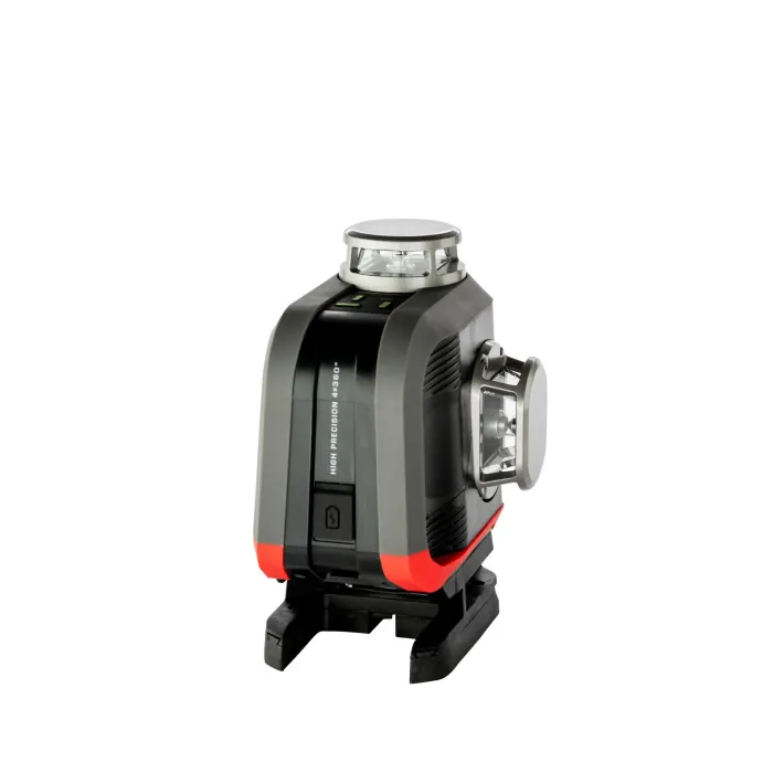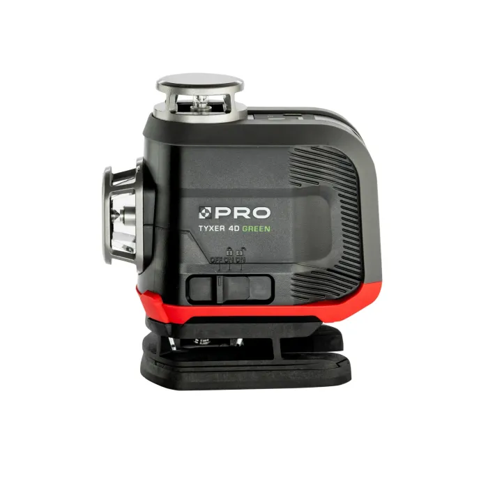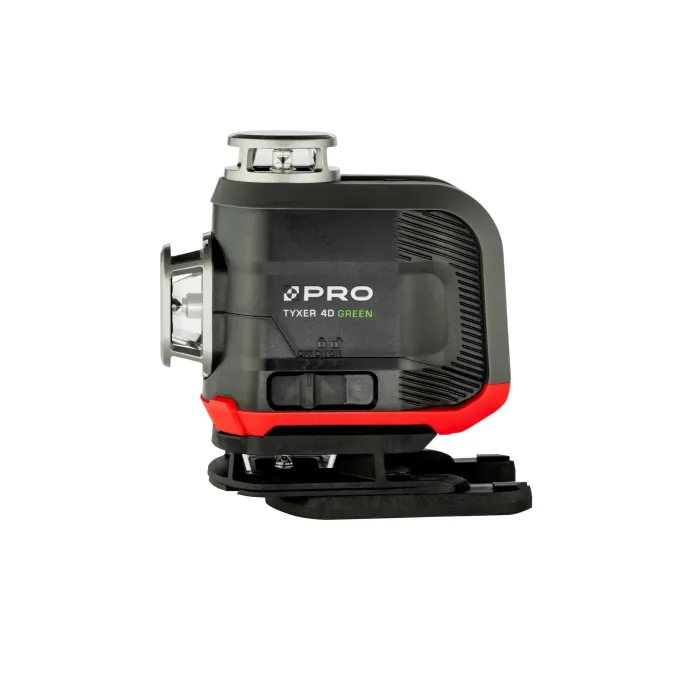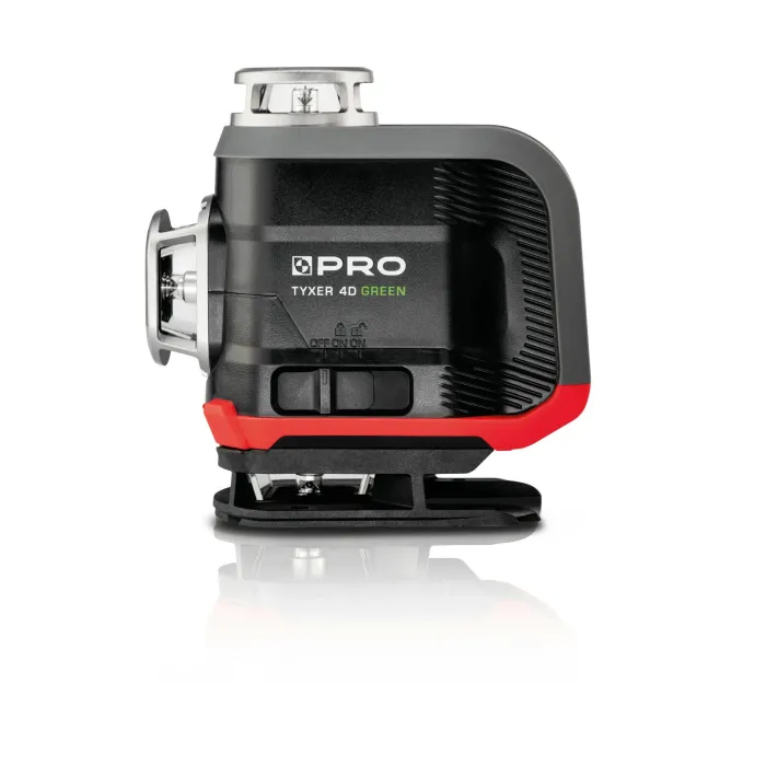 Функцията за заключване на махалото позволява маркиране на всякакви склонове. Режимът на маркиране на склонове се индикира от мигане на лъча на всеки 5 секунди. Импулсният режим за работа с детектор увеличава работния обхват на лазера. При условия на слаба околна светлина, може да се използва като ECO функция за удължаване на времето за работа и подобряване на комфорта на потребителя. Функция за лазерен отвес - оста на кръста на тавана и земята маркира вертикала. Многолинейният лазер TYXER 4DG генерира 4 равнини от 360°, две хоризонтални и две вертикални, пресичащи се под ъгъл от 90°. Моделът TYXER 4DG има подвижен крачен елемент, който след демонтиране позволява на устройството да проектира долната греда на ниво, вече на 8,5 мм от земята. Лазерът се самонивелира благодарение на магнитното махало. Устройството е с клас на защита IP54. Отклонението на устройството извън работния диапазон ±3° се индикира с бързо мигане на лазерната линия. ¼” резбата в основата на лазера позволява бърз и лесен монтаж на статив или телескопичен прътл