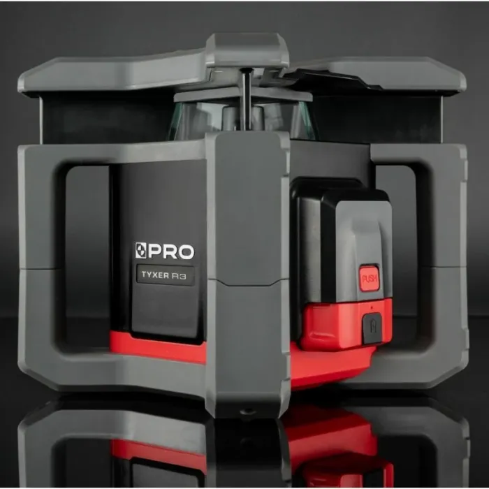 Функция за аларма за накланяне (TILT), която е резултат от удар или нарушаване на първоначалната позиция на устройството, след което устройството трябва да се рестартира ръчно. Ръчен режим за настройване на равнината под произволен ъгъл на наклон. Ротационен лазерен нивелир TYXER R3 с видим червен лъч.За употреба на открито и закрито. Автоматично, моторно контролирано настройване както на хоризонтално, така и на вертикално ниво с възможност за цифрово регулиране на наклона независимо по две оси X и Y. Водоустойчив клас IP54.