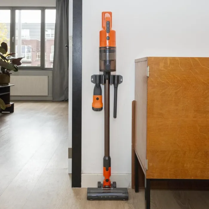Лесно транспортиране и съхранение: Благодарение на безжичния, компактен дизайн и практичната дръжка за носене, можете лесно да пренесете прахосмукачката навсякъде. Свършили сте с прахосмукачката? Използвайте монтажната скоба, за да закрепите прахосмукачката към стената. По този начин тя винаги ще се съхранява спретнато и да не ви пречи.