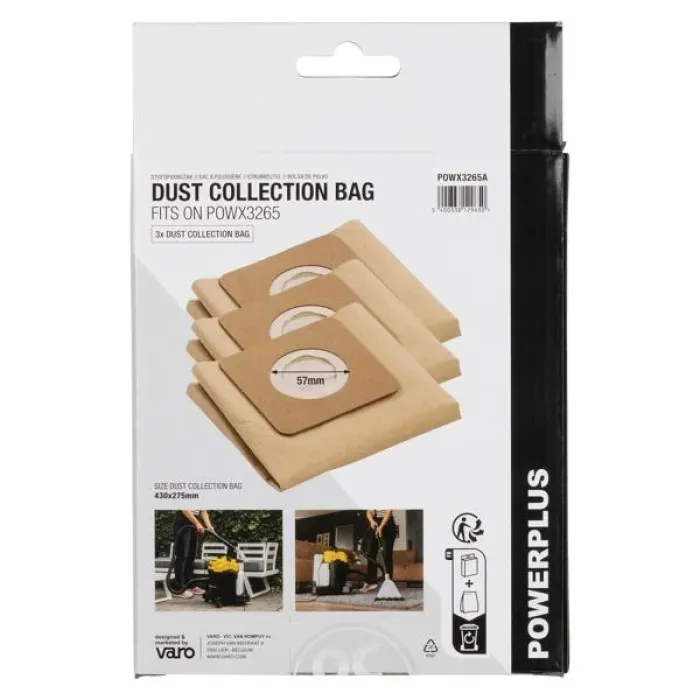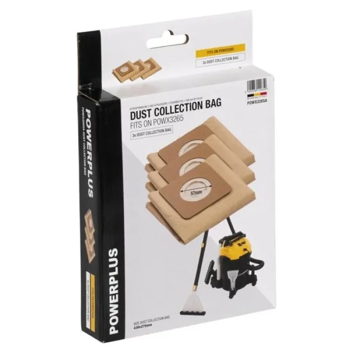 Те имат монтажен отвор с диаметър 57 мм и са съвместими с прахосмукачката/почистващата машина за килими POWX3265 за мокро и сухо почистване. Този комплект Powerplus съдържа 3 хартиени торби за прах с размери 430 мм x 275 мм.