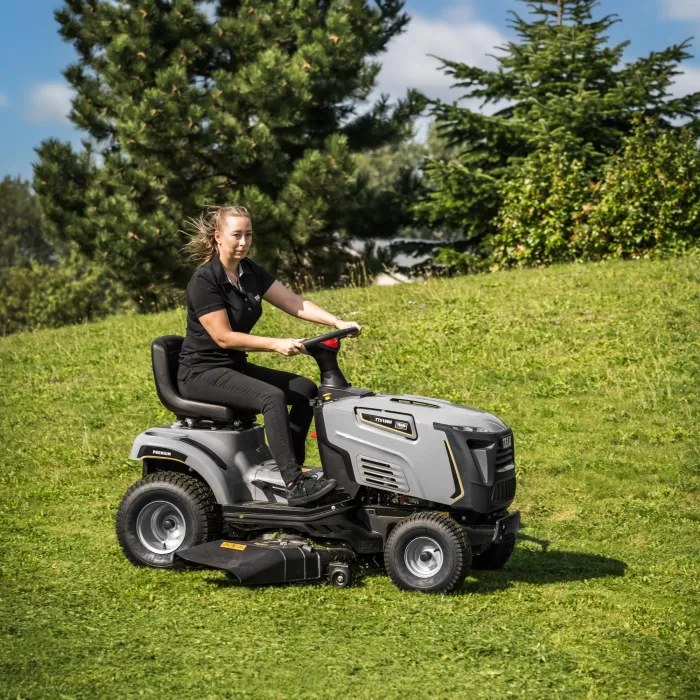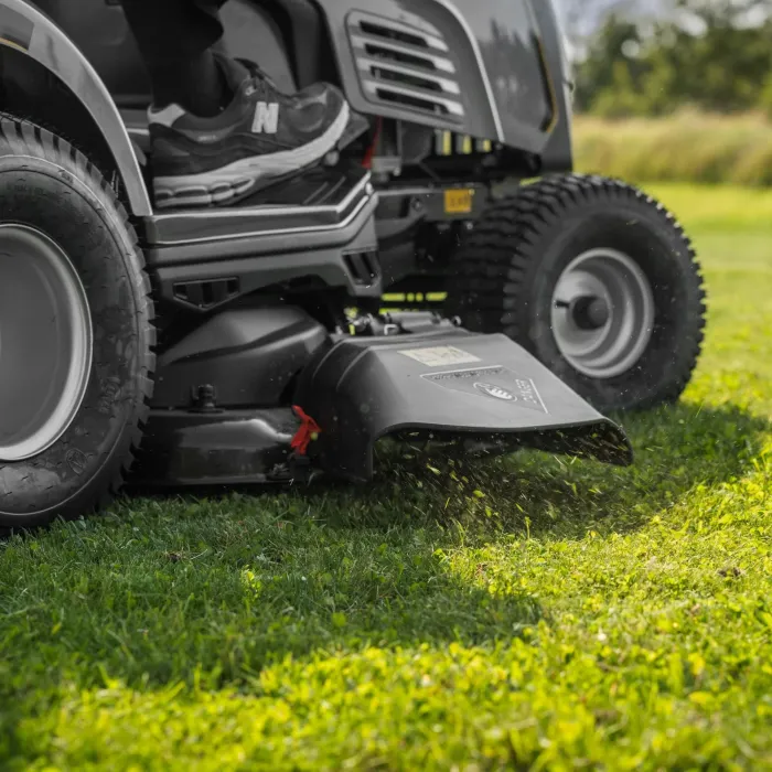 С голяма ширина на косене от 108 см, получавате ефикасен, удобен и здрав градински трактор, а включени са предпазител за мулчиране и кука за теглене на аксесоари.