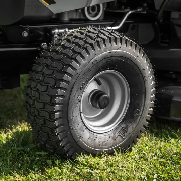 Предните колела са 15", а задните са 18", като и четирите колела са пневматични гумени колела с богат профил, което гарантира добро сцепление със земята, а голямата им ширина ги прави по-щадящи към тревата.