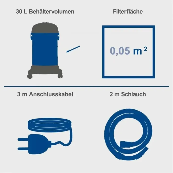 Електрическата прахосмукачка за сухо и мокро почистване, предназначен за домашна употреба и работилницата. Разполага с мощен 1200 W мотор, голям 30-литров контейнер от неръждаема стомана и практична функция за издухване. Благодарение на включените аксесоари и мобилната конструкция с 4 колела, уредът е подходящ за почистване на работилници, гаражи, мазета и строителни обекти.