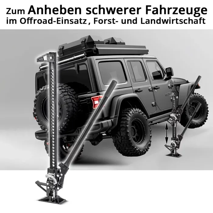 Механизмът с рейка и пиньон на крика за извън пътя осигурява оптимално предаване на мощността. Превозни средства или ремаркета могат да се повдигат без усилие само с няколко прости стъпки. Дългият лост на крика за високо повдигане има гумирана дръжка с неплъзгащ се профил, стои здраво в ръката и е удобен за работа. Изключително широката основа на универсалния крик осигурява сигурно задържане дори върху неравни повърхности. С товароносимост от 3 тона, здравият крик с рейка и пиньон е идеален за повдигане на тежки превозни средства, като например офроуд автомобили, SUV-ове, каравани, лекотоварни автомобили, както и горска и селскостопанска техника. Освен това, многофункционалният крик с рейка може да се използва и като винтова скоба, повдигащо устройство или затягащ инструмент благодарение на свободно позиционираща се затягаща челюст. 48-инчовият селскостопански крик има изключително голяма височина на повдигане от 13-104,5 сантиметра, което прави тежкотоварния крик идеален за употреба извън пътя.