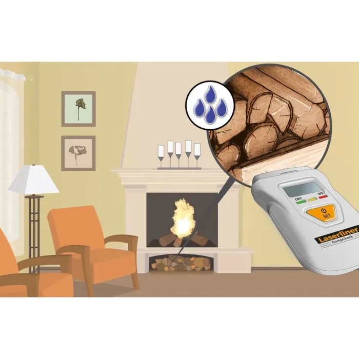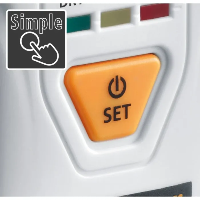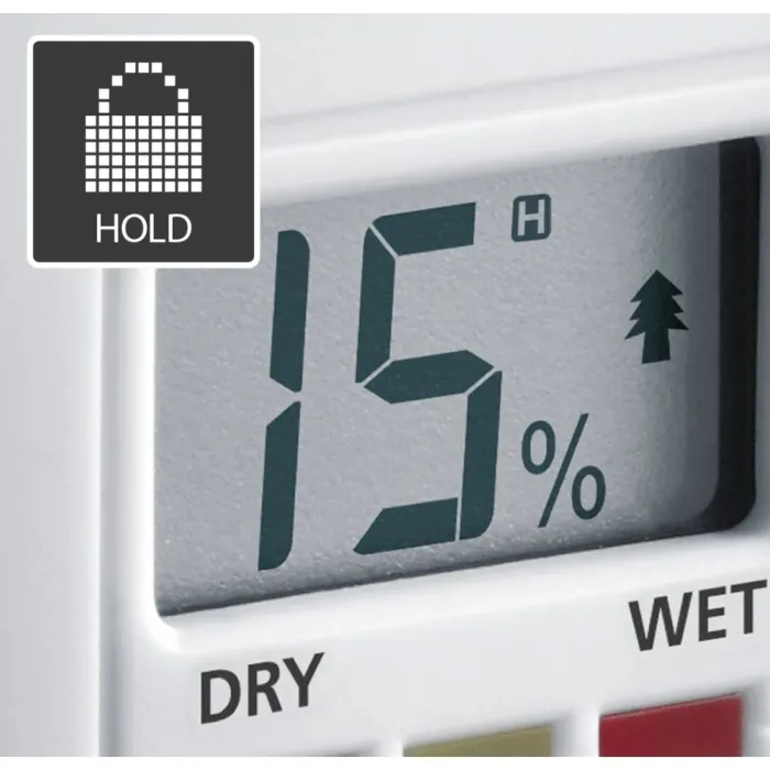 Може да се използва и за определяне на температурата на околната среда в диапазон на измерване от 0° до 40° и съдържанието на влага в меки строителни материали. Индикаторът за мокро/сухо състояние има три цветни светодиода и предоставя незабавна информация за степента на влажност или сухота в проверявания материал. Това компактно устройство за измерване на влага осигурява лесен начин за тестване на степента на сухота на дървата за огрев, за да се пести енергия и да се намалят емисиите. Резултатите се показват числено, а текущата измерена стойност може да се запази на дисплея с помощта на функцията за задържане. Корпусът е изработен от голяма част от рециклирана пластмаса и има ценен принос за устойчивостта.
