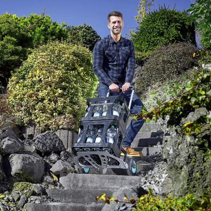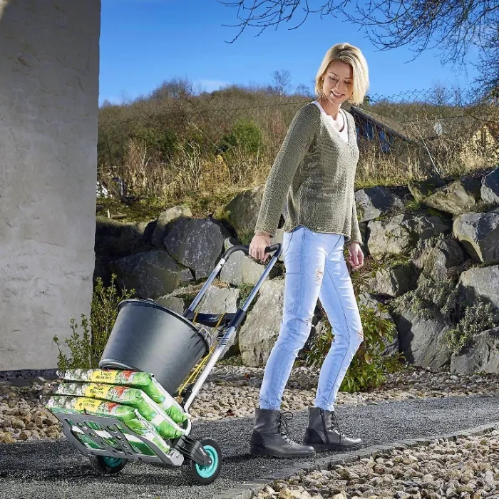 Закръглената гумирана ръкохватка с практичен бутон за централно заключване може да се издърпа до 110 см и осигурява достатъчно свободно пространство при транспортиране на високи, обемисти предмети. В сгънато положениеTS 850 Offroad е с размери 500x820x77 мм. Двете извити задни подпори поддържат оптимално кръгли предмети, а здравата напречна греда улеснява накланянето на количката. С товароносимост до 100 кг, багажната количка Wolfcraft TS 850 Offroad е оборудвана с устойчиви на пробиване бандажни колела с широк профил и диаметър 18 см - идеални за използване на стъпала и на практически всички външни терени. Солидната платформа от лят алуминий с размери 490x280 мм и 3-точковото фиксиране с множество опции за монтаж осигуряват здраво закрепване и транспортиране на товара във всяка ситуация и на всякакъв терен.