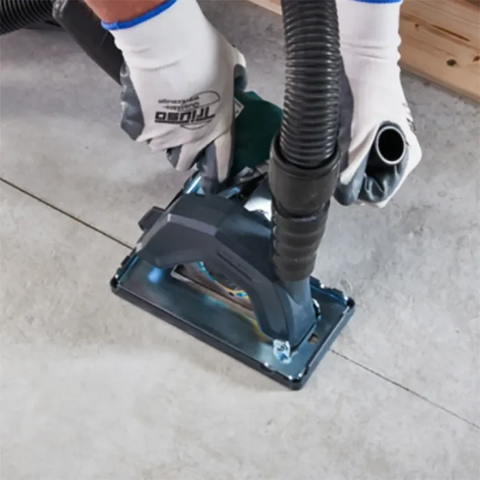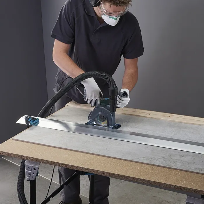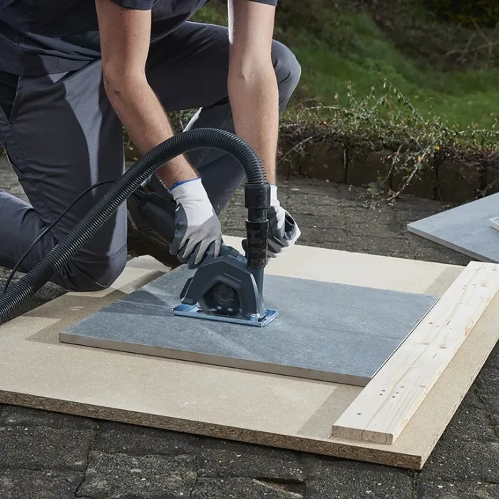 Чрез удължителя на шпиндела той може бързо и без инструменти да се монтира на всички ъглошлайфи. Монтажният ъгъл може да се регулира за най-удобна индивидуална работна позиция. За максимална безопасност при работа шпинделът е обвит отвсякъде с гумен маншет. Капакът, изработен от здрав, удароустойчив поликарбонат.Връзката за прахосмукачка е съвместима с всички промишлени прахосмукачки с маркуч ф 32-36 мм. Прахът се отвежда директно от долната страна на направляващата шейна. Благодарение на аспирацията в непосредствена близост до мястото на рязане, тя работи много ефективно и прави работата особено безпрашна и чиста. Направляващата шейна със страничен ограничител за направлявани срезове подпомага при дълги прави срезове. Желаната позиция на рязане се вижда през прозорчето за наблюдение. Прахолуловителният предпазител с направляваща шейна позволява безопасна и незамърсяваща с прах работа с ъглошлайф с диамантени режещи дискове с диаметър 115 и 125 мм.