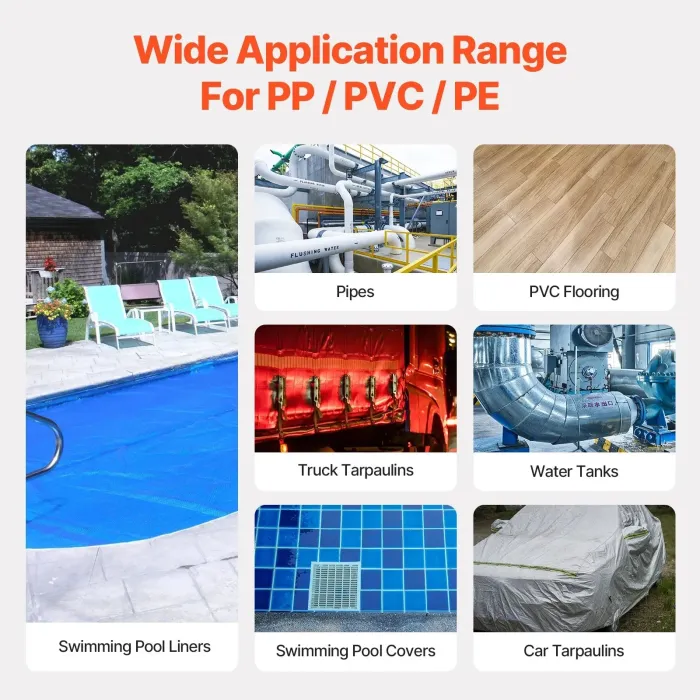 Благодарение на компактния си и ергономичен дизайн, пистолетът е удобен за захват, лесен за пренасяне и подходящ както за начинаещи, така и за професионалисти. Комплектът за заваряване с горещ въздух VEVOR е оборудван с мощен 1600W мотор, което го прави идеален за формоване, заваряване и огъване на термопластични материали.
