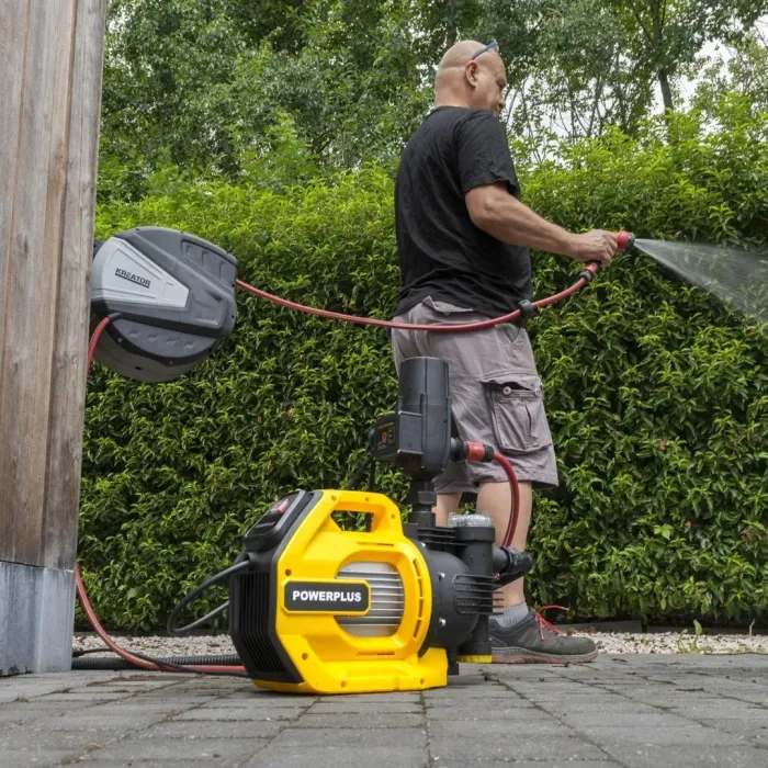 Тази помпа е чудесна и за употреба на закрито. Тя ви позволява да пускате тоалетната си по екологичен начин с дъждовна вода. Хидрофорната помпа с мощност 1100 W може да изпомпва чиста вода от максимална дълбочина на засмукване 8 м, например от резервоар за дъждовна вода или кладенец, и да изпомпва до височина на налягането 48 м. Тази хидрофорна помпа Powerplus ви позволява да изпомпвате вода, така че да можете да поливате растенията, цветята и тревата си по екологичен и бюджетен начин.