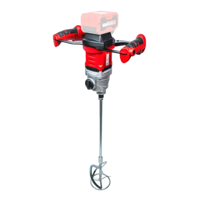 Машианта е оборудвана със стандартна присъединителна резба M14 x 2 mm, което гарантира широка съвместимост с различни видове бъркалки и улеснява подмяната им според конкретното приложение. В комплекта е включена бъркалка с размери Ø120 x 590 mm, която осигурява ефективно смесване дори при по-големи количества материал.