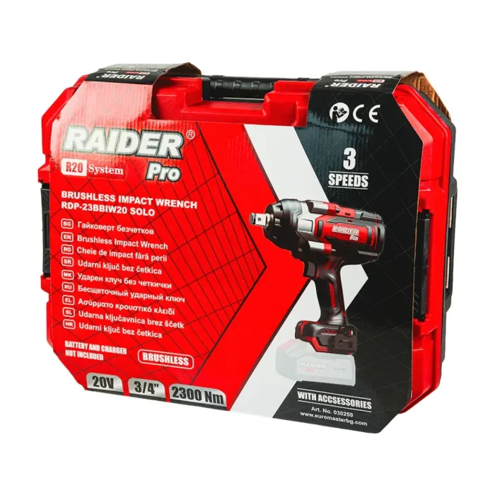 С максимален въртящ момент от 2300 Nm, гайковертът безпроблемно се справя със силно затегнати, ръждясали и натоварени болтове и гайки. Гайковерт безчетков е най-мощният акумулаторен гайковерт в категорията Raider R20 Pro, създаден за професионална употреба при екстремни натоварвания. Инструментът е проектиран за интензивна работа в сервизи, строителството, индустрията и поддръжката на тежка техника. Моделът е оборудван с високоефективен безчетков мотор (Brushless), който осигурява значително по-дълъг експлоатационен живот, по-ниско загряване и по-ефективно използване на батерията.