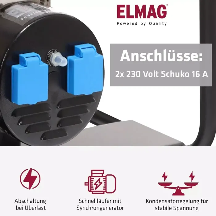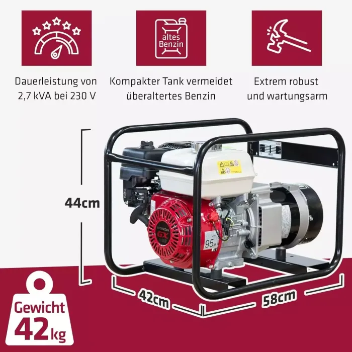 Здравата тръбна рамка предпазва устройствата по време на сервизно обслужване, обслужване на клиенти и монтажни работи, както и за захранване на строителни площадки, за комунални услуги и в селското стопанство. Бензиновите бързооборотни машини със синхронен генератор са правилният избор, когато става въпрос за краткосрочно захранване на всякакви консуматори на енергия и инструменти. Това включва осветителни системи, бойлери, вентилатори за горещ въздух, котлони, бормашини, ръчни циркулярни и верижни триони, косачки за трева, водни помпи и др.