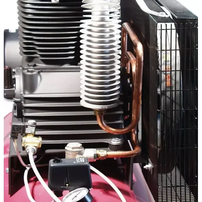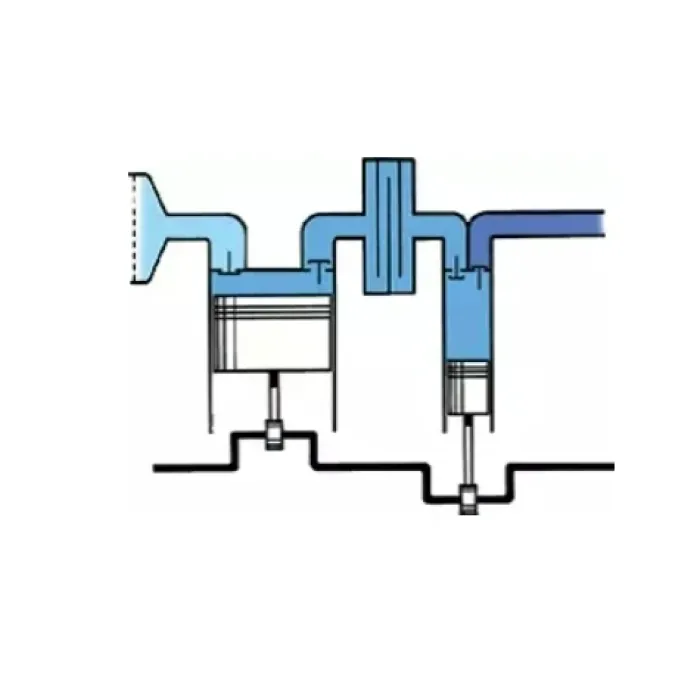 Двустепенният компресор има два цилиндъра, разположени последователно, които компресират въздуха на два етапа до крайното налягане. В процеса сгъстеният въздух се охлажда от въздух. Това подобрява ефективността и същевременно може да се постигне по-високо налягане, отколкото с едностепенен компресор.