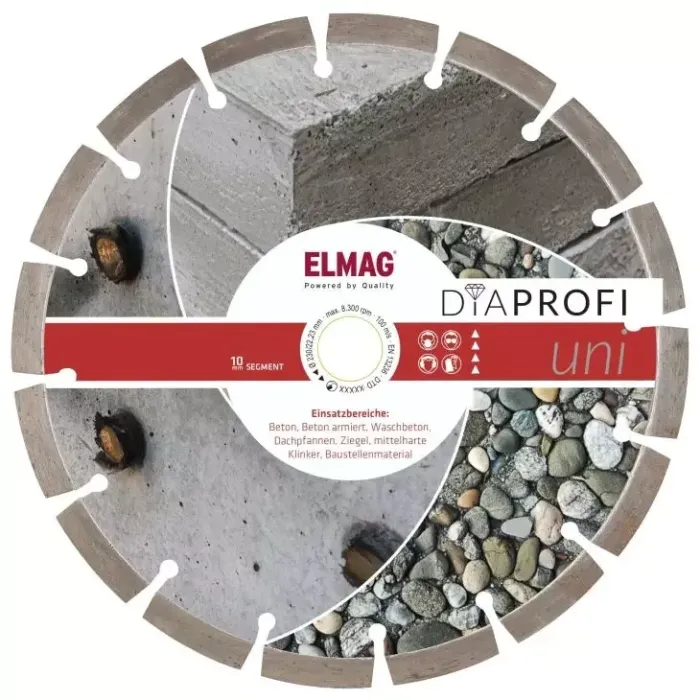Подходящ за бетон, стоманобетон, мит бетон, керемиди, тухли, средно твърд клинкер, строителни материали. За мокро и сухо рязане. Много мощен диамантен режещ диск с дълъг експлоатационен живот - бестселър за строителната площадка.