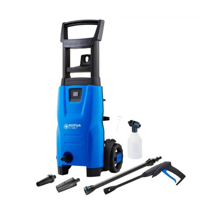 Водоструйка C 120.7-6 EU се предлага фабрично с надеждна метална помпа за високо налягане. Това осигурява много по-продължителен режим на работа и дълъг живот на машината. Термичната защита и автоматичната старт-стоп система помагат за голямата издъжливост на модела. Благодарение на тези системи, дори и при по-интензивни почиствания се предпазват основните компоненти – помпа и мотор. Този модел водоструйка на NILFISK предлага несравнимо по-голям дебит на водата от конкурентите си – 440 l/h, което е най-важният показател за бързото отмиване на всякакви замърсявания. Дебитът на водата е количеството вода, което излиза от машината за единица време. Може да се подава топла входяща вода до 40°C. В комплекта на моделът стандартно са включени – водна дюза, ротационна дюза и съд за препарат, който се монтира на струйника. Всички дюзи, накрайници и опционални аксесоари са поставят лесно, с „клик“ система на струйника, без необходимост от завиване или допълнителни инструменти. Стандартно в окомплектовката е включена и игла за отпушване на дюзите при запушване. Опционално се предлагат много аксесоари, накрайници и системи за допълване на основните функции на водоструйката.