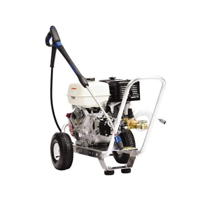 MC 5M-250/1000 PE e водоструйна машина с бензинов двигател и благодарение на пневматичните гуми и малко тегло е идеален избор при почистване на места, където няма достъп до електричество. Има възможност за потребление на вода с малък или без дебит от контейнер или естествен водоизточник. Използва се основно в строителството и селското стопанство. Характеризира се с надеждна, здрава помпа за високо налягане с керамични бутала, отворен дизайн и уникална сила на почистване.