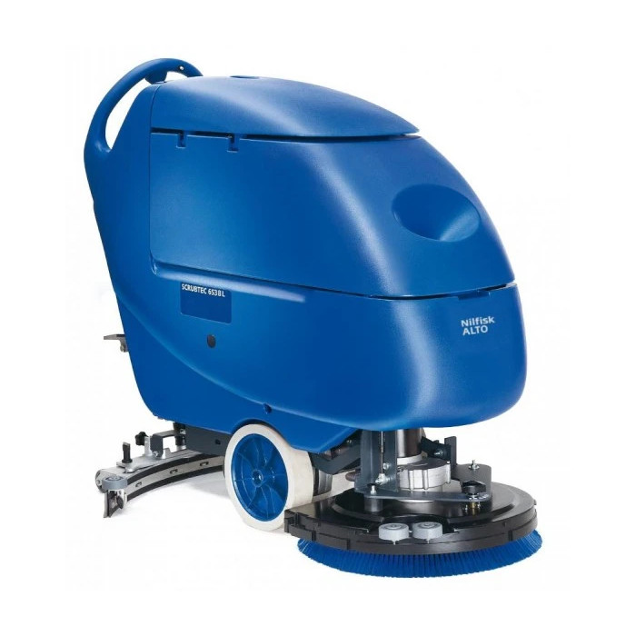 SCRUBTEC 653 BL е среден клас подопочистваща машина,притежаваща с акумулаторни батерии с дискова четка за разтъркване и смукателна система, която се характеризира с голяма производителност и лесна експлоатация. Този подопочистващ автомат е оборудван с иновативна самоходна система - тракшън контрол, както и регулиране на натиска на четките, което гарантира най-добите резултати при почистване. Машината се предлага с два резервоара с оптимален капацитет – за чиста и мръсна вода. Управлението е удобно и интелигентно, благодарение на бутоните разположени на дръжките, което го прави лесен за пускане и спиране при работа. Лесна и бърза проверка на нивото на водата в контейнера за чиста вода, както и наличие на дренажен шланг за отвеждане на мръсната вода, където е необходимо. Разполага с вградено зарядно устройство и LED индикатор на нивото на заряд на батериите. Мощната смукателна система и извития дизайн на смукатела се грижат за пълното изсушаване на работната повърхност. Контейнерът се пълни лесно и бързо през удобния отвор с капачка. Минимална консумация на вода, чрез контрол на изразходваното количество. Пълен достъп до контейнерът за мръсна вода, което е удобно за измиване и поддръжка. Моделът автомат разполага с подготовка за поставяне на инжектор за прецизно впръскване на химически препарати и дизефектанти. Този модел се предлага без дискова четка, зарядно устройство и акумулаторни батерии в стандартната окомплектация.